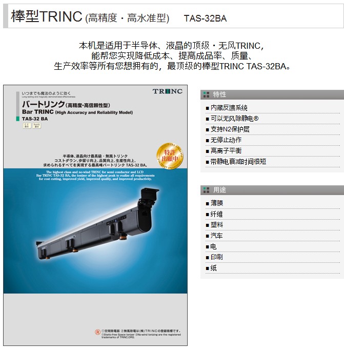 為了防止因為風而引起的微粒的四處飛散,讓無塵室、無塵工作臺的能力得到100%的發(fā)揮,無風除靜電是必不可少的。日本TRINC除靜電裝置,世界上首次使用*的技術(shù),在廣大空間里釋放離子,讓工廠里的靜電全部消失,實現(xiàn)灰塵完全不附著的無塵環(huán)境。TRINC, 又名"無墻防塵" 在汽車、電子、化工、食品、藥品等各個領(lǐng)域里,大量減少了由異物不良品。